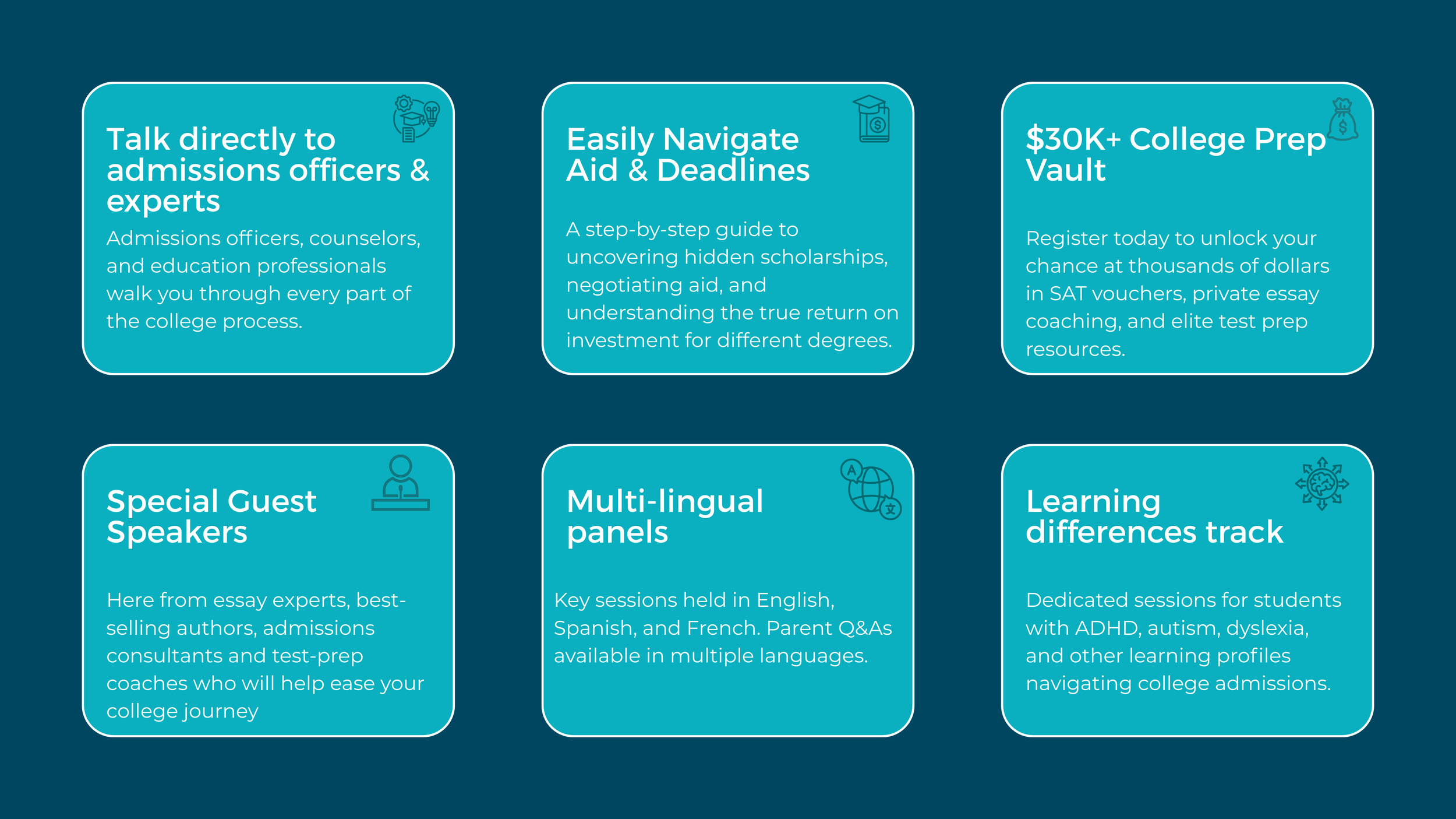 The Break into College Conference is a free, three-day virtual event created to help students and families make informed, confident decisions about college. With expert-led sessions on everything from affording college and understanding different types of schools, to navigating the process with learning differences, applying to specialized programs like engineering, arts, business, or international schools, and even pursuing nontraditional paths like ROTC or community college—we’re committed to making the college journey more transparent and achievable for all.